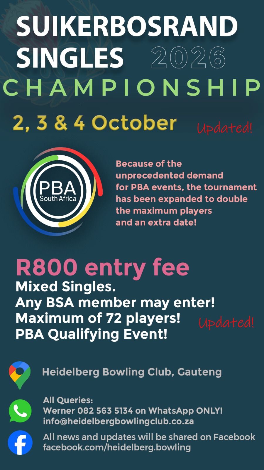 • Winner will receive an invite to the World Bowls Tour Qualifying Event to be held at the Durbanville Bowling Club in March 2026 (this is not a free entry)